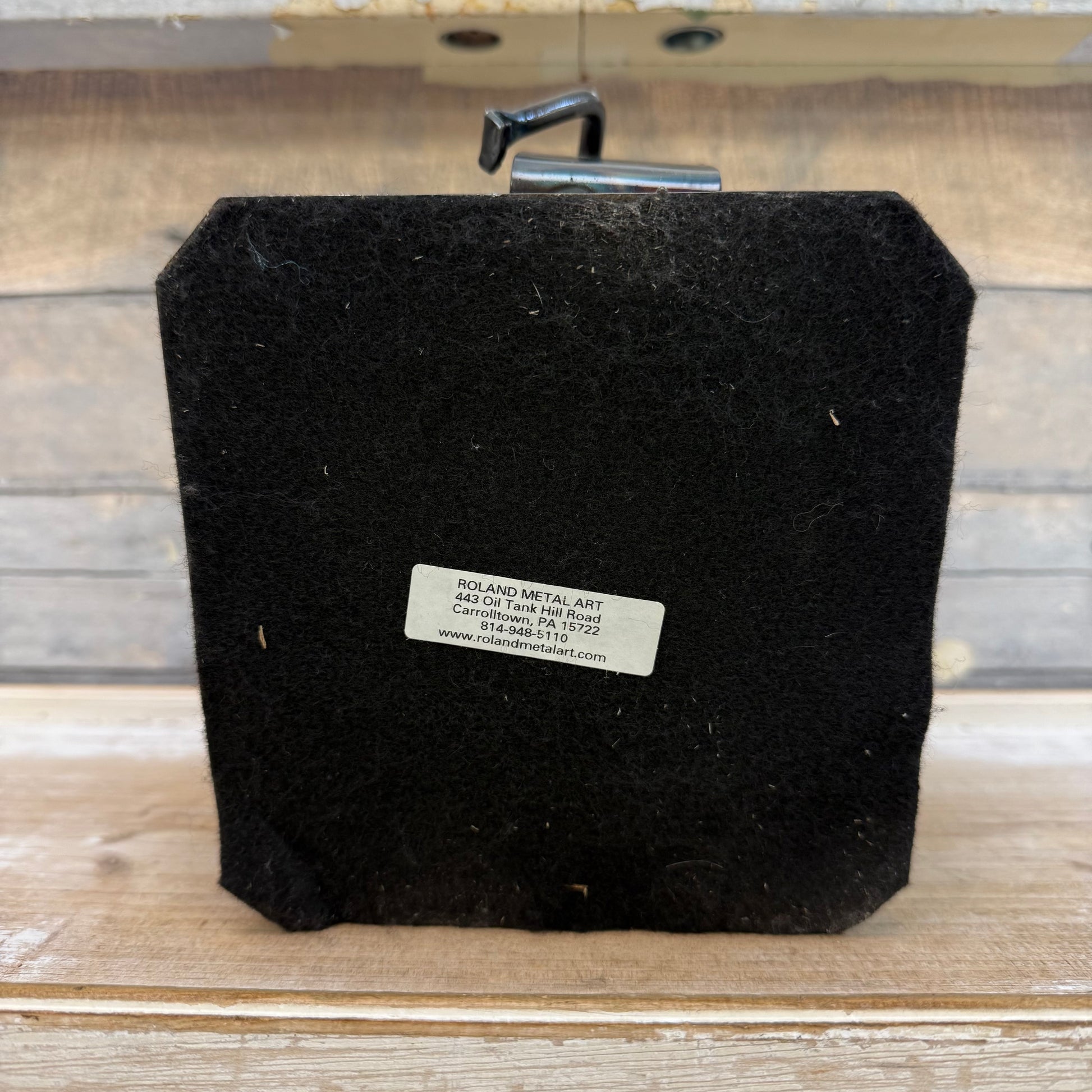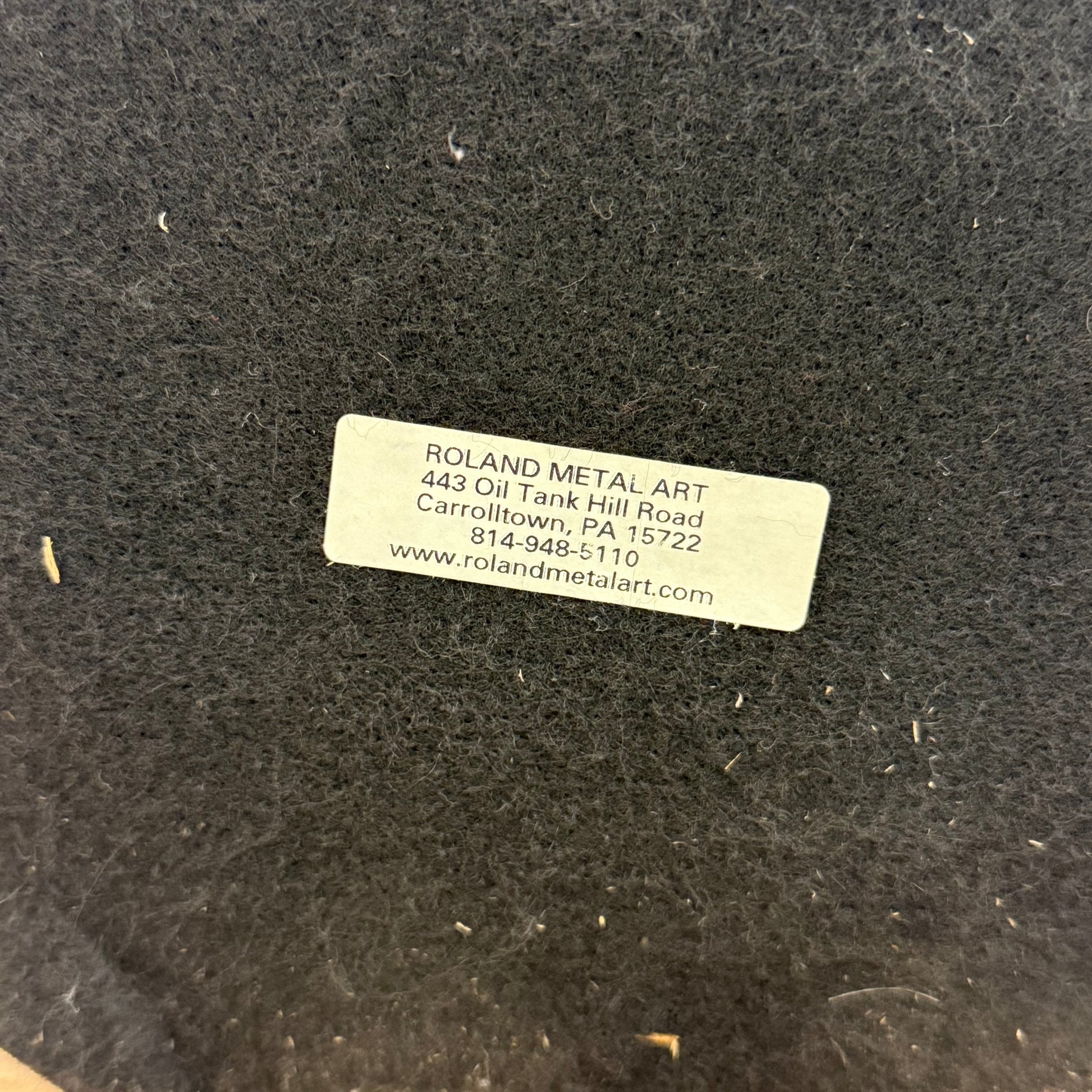 Add industrial charm and a playful twist to your collection with this Roland Metal Art Poker Game sculpture, a unique piece crafted from railroad spikes and repurposed metal elements. Depicting a lively card game, this hand-forged artwork showcases the creativity and character that make Roland’s metal art so collectible. The piece is in good vintage condition with only minor wear from age and use, though the felt bottom is beginning to separate from the metal base. Featuring the maker’s mark on the underside, this sculpture is both a conversation starter and a one-of-a-kind example of Americana folk art, perfect for display in a game room, office, or art collection.