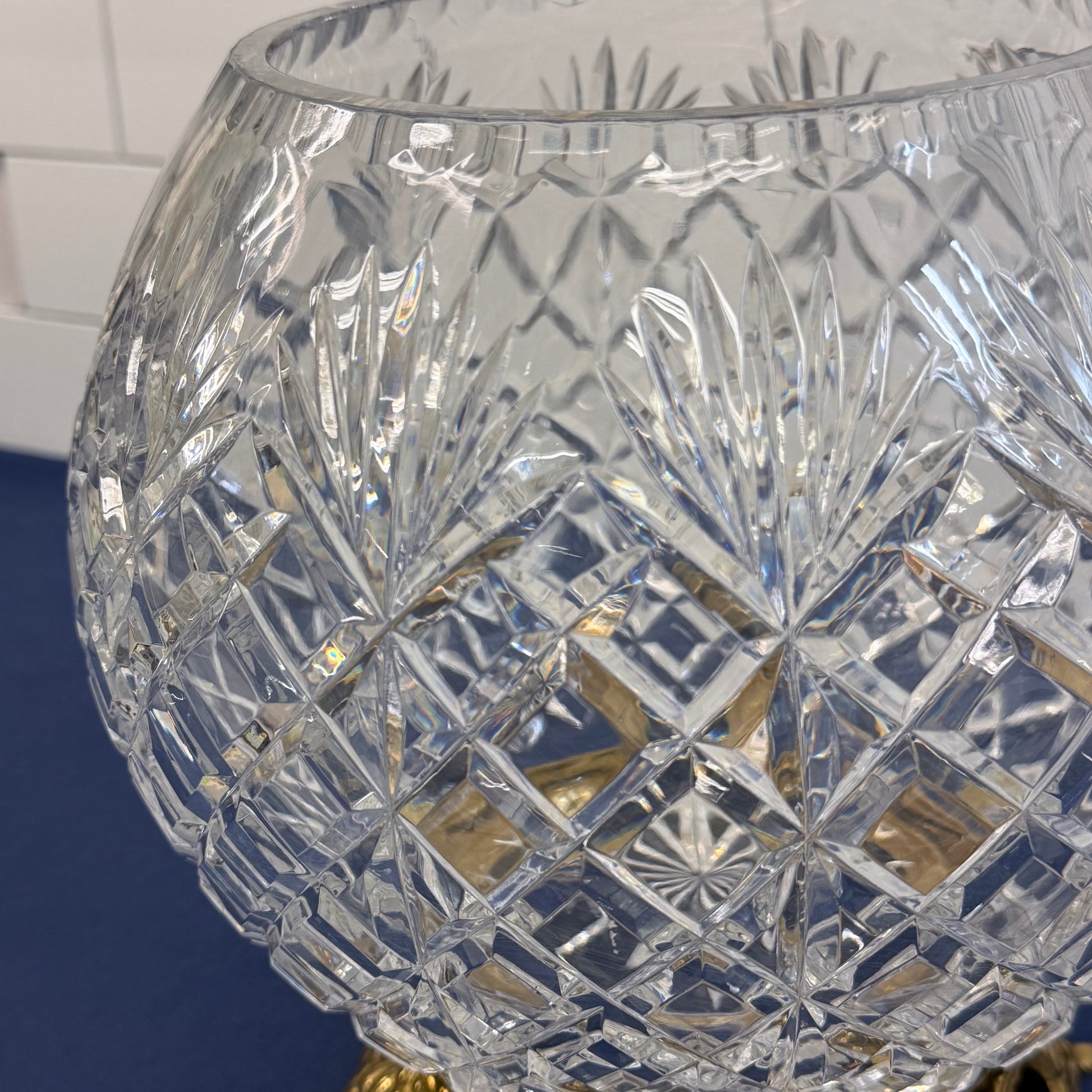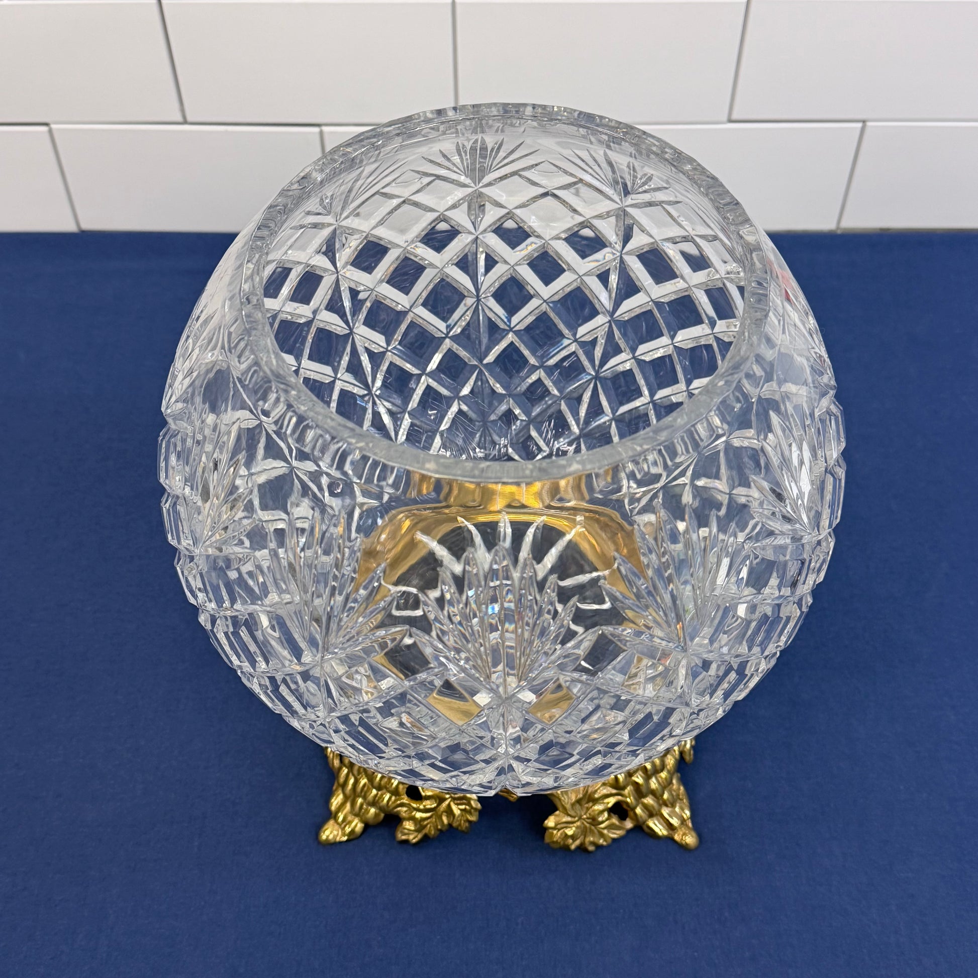 Hollywood Regency Cut Crystal Rose Bowl Brass Stand