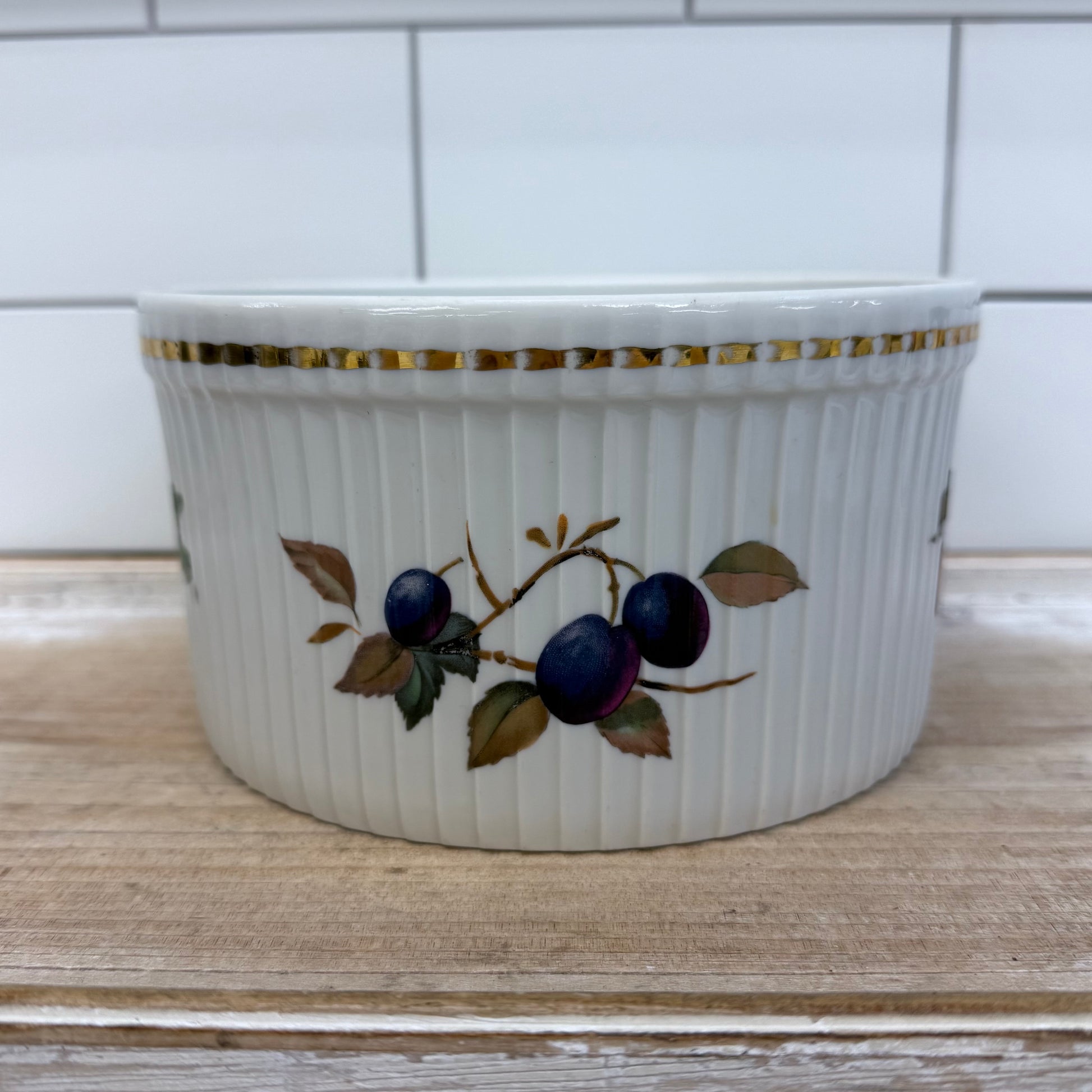Keywords: Royal Worcester, Evesham Gold, porcelain baking dish, vintage kitchenware, gold trim, fruit pattern, collectible dish, 7x4 inches, fine china, classic cookware