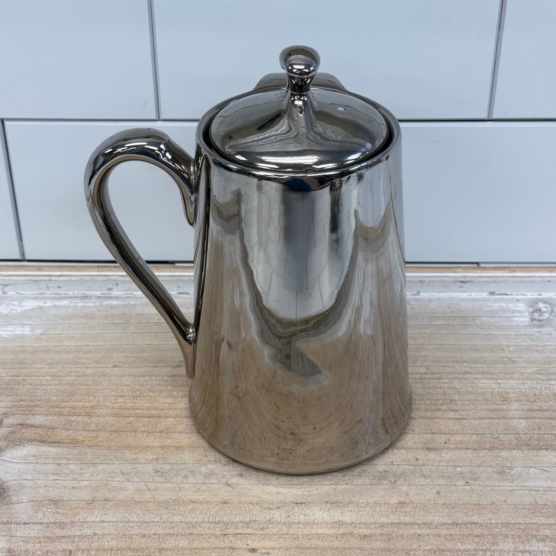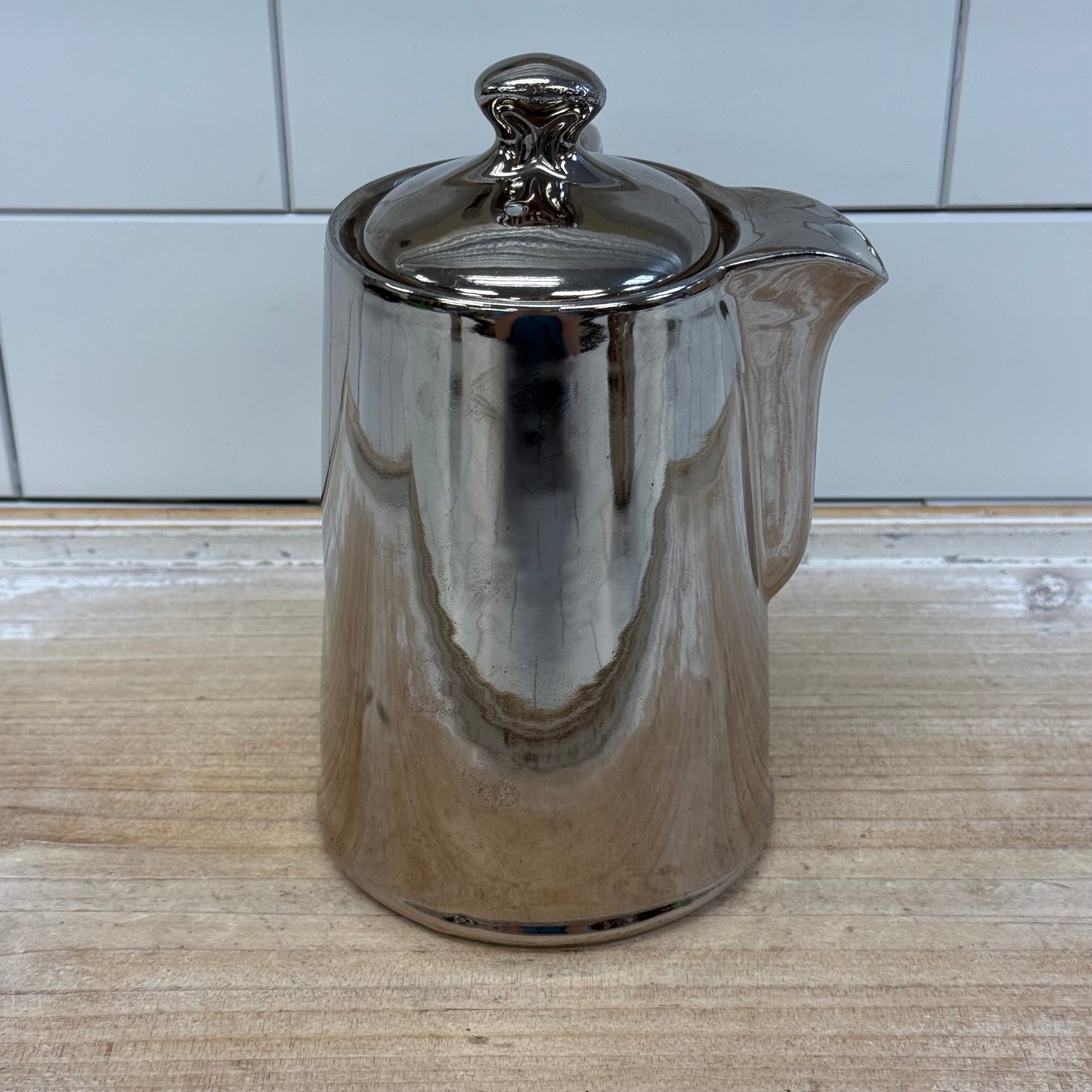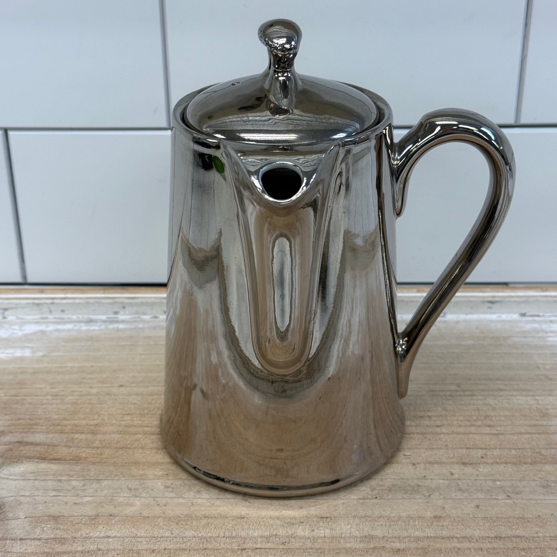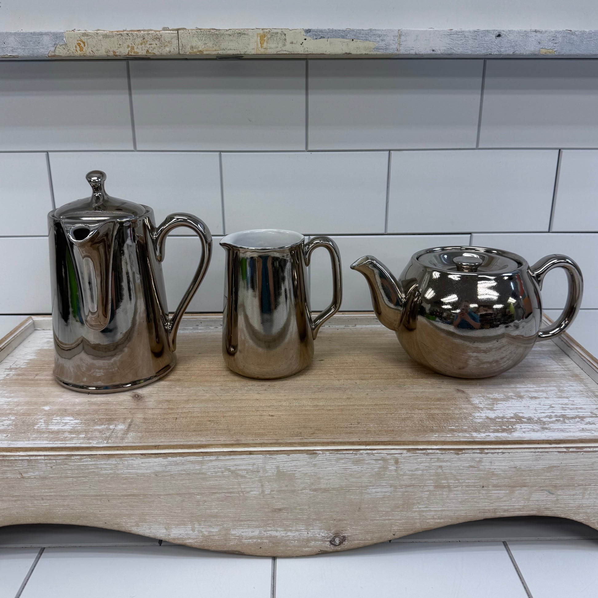 Serve in timeless elegance with this Royal Worcester True Porcelain Silver Lustre Tea Service, Set of 3. The set includes a coffee pot (6”x4”x7”), a teapot (8”x5”x4”), and a pitcher (4”x3”x5”), each adorned with a refined silver-lustre finish that highlights the exquisite craftsmanship of Royal Worcester. In good vintage condition with only minor wear consistent with age, every piece bears the authentic maker’s mark on the underside, making this set both a functional tea service and a beautiful collectible for lovers of fine porcelain.