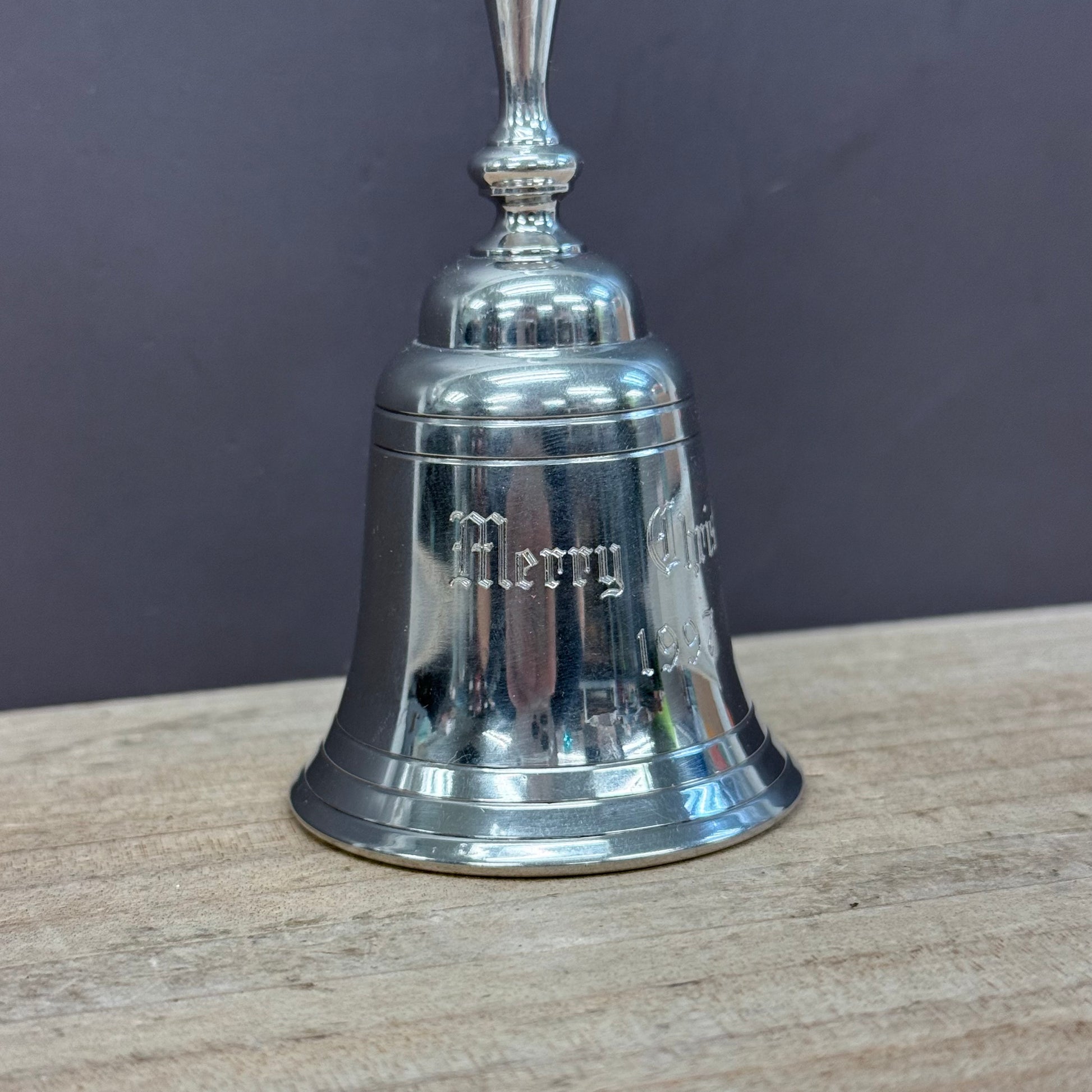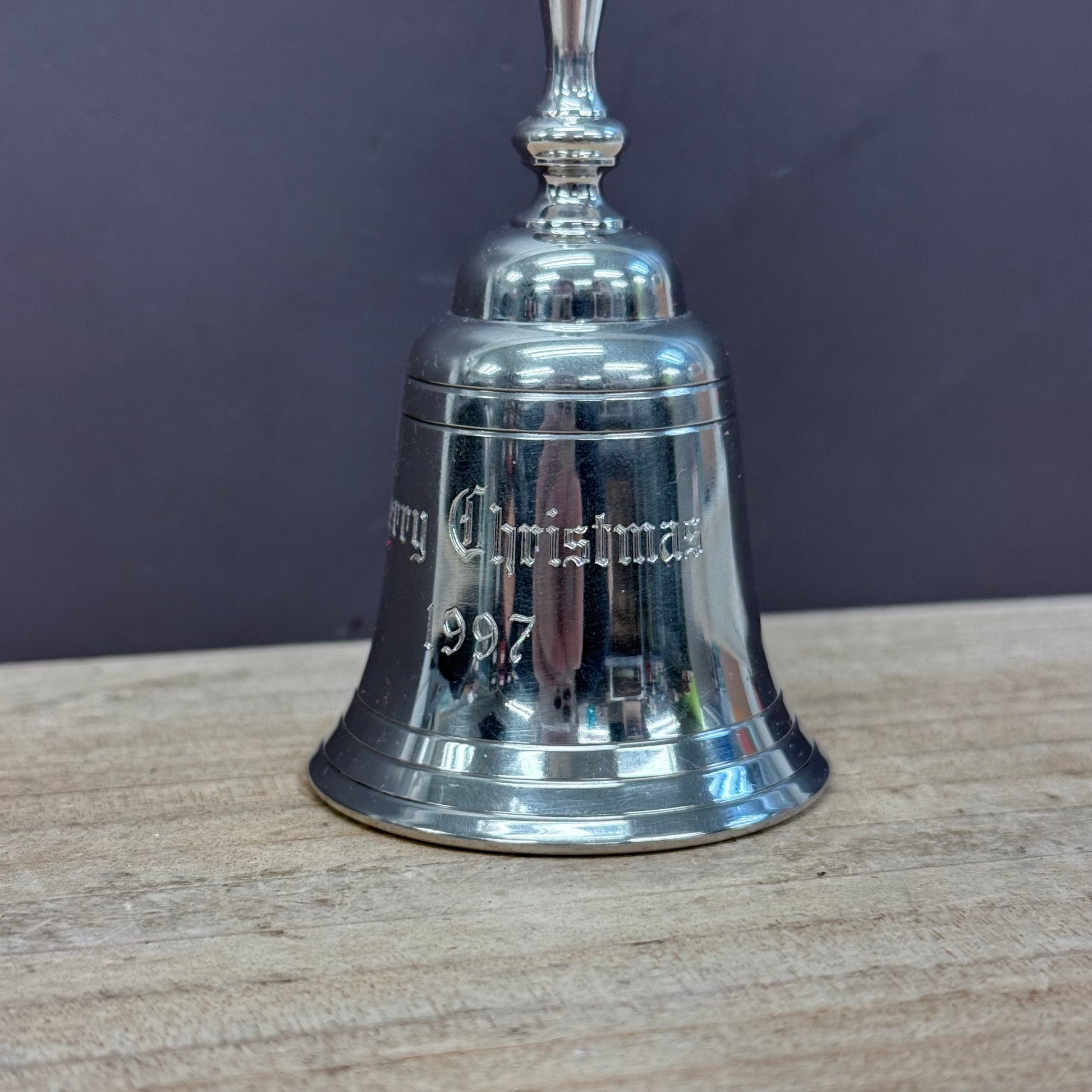 Keywords: Shirley Pewter, Christmas bell ornament, engraved pewter, vintage holiday, 1997 collectible, hand bell, tree decoration, boxed ornament, festive decor, seasonal collectible