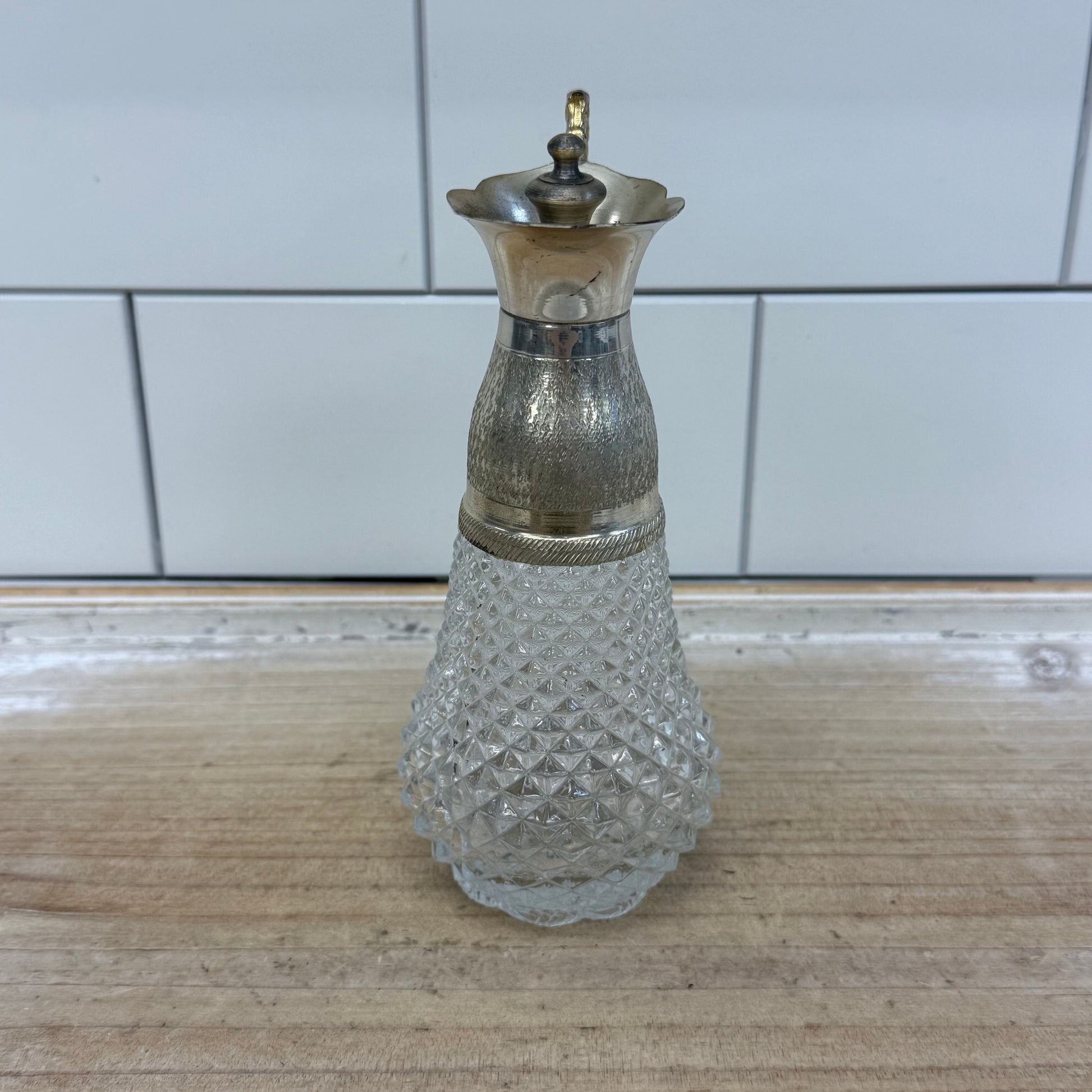Elegant and refined, this Silver-Plated Pressed Glass Claret Pitcher from Italy is a stunning example of vintage craftsmanship. Featuring a sparkling diamond point pattern, the pitcher combines clear pressed glass with a silver-plated section marked by the maker on the bottom rim, attesting to its Italian origin. Complete with an airtight stopper, it measures 3”x6” and is perfect for serving fine wines or as a decorative collectible. In good vintage condition with minor wear consistent with age and use, this piece brings timeless European elegance to any table or display.