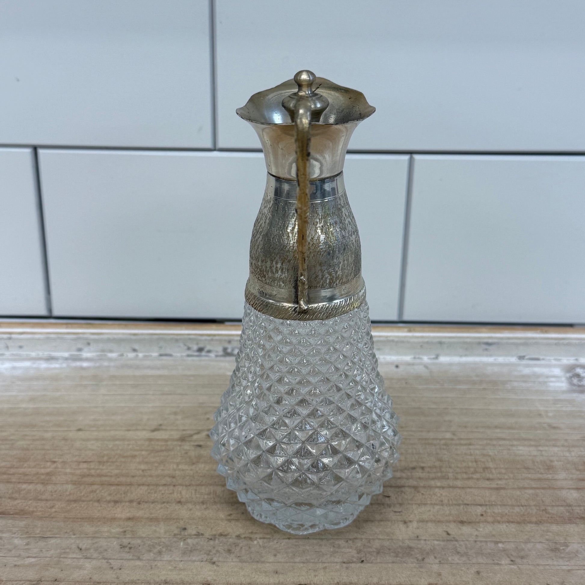 silver plated, pressed glass, claret pitcher, Italian craftsmanship, vintage serveware, diamond point pattern, airtight stopper, collectible glassware, made in Italy, elegant tablewarec