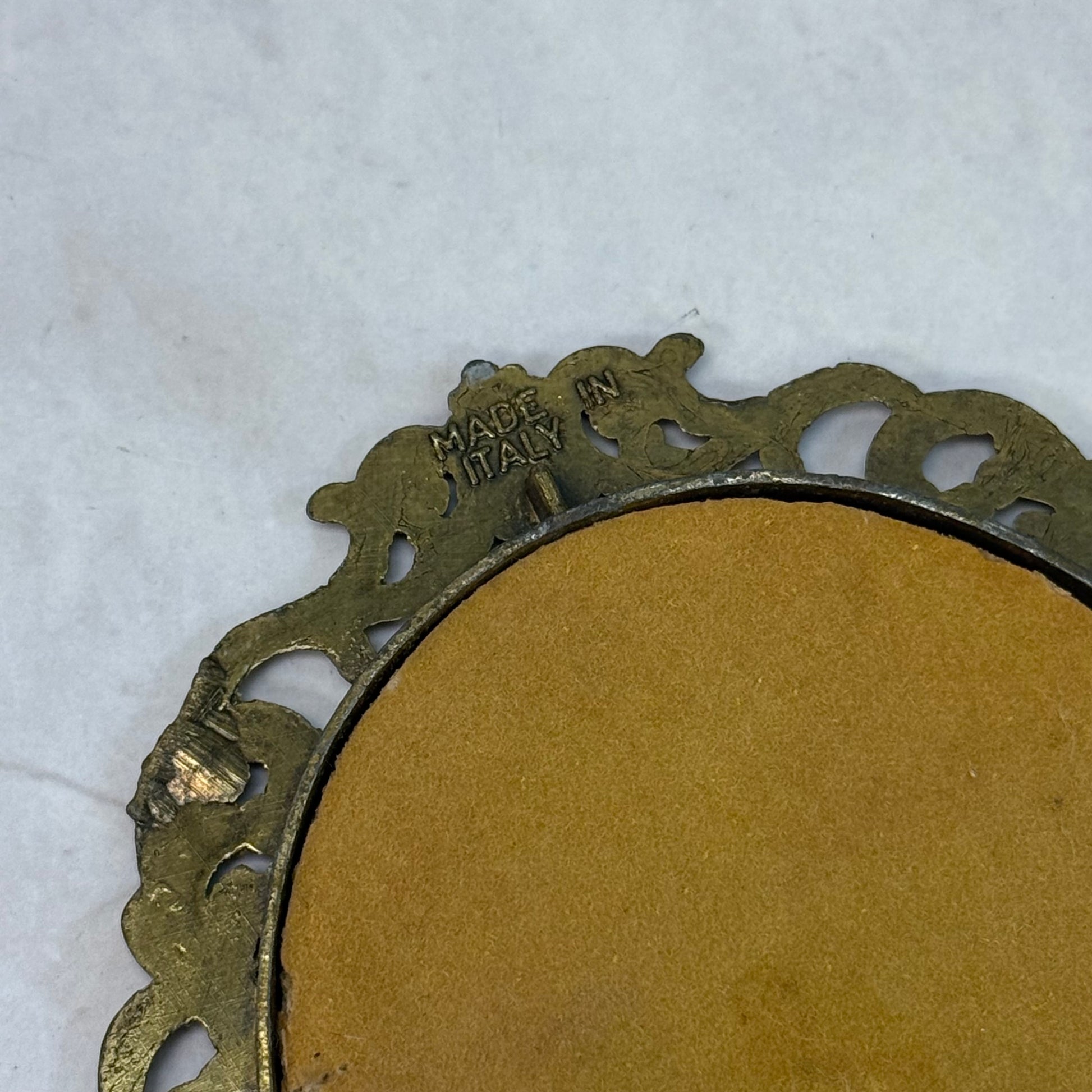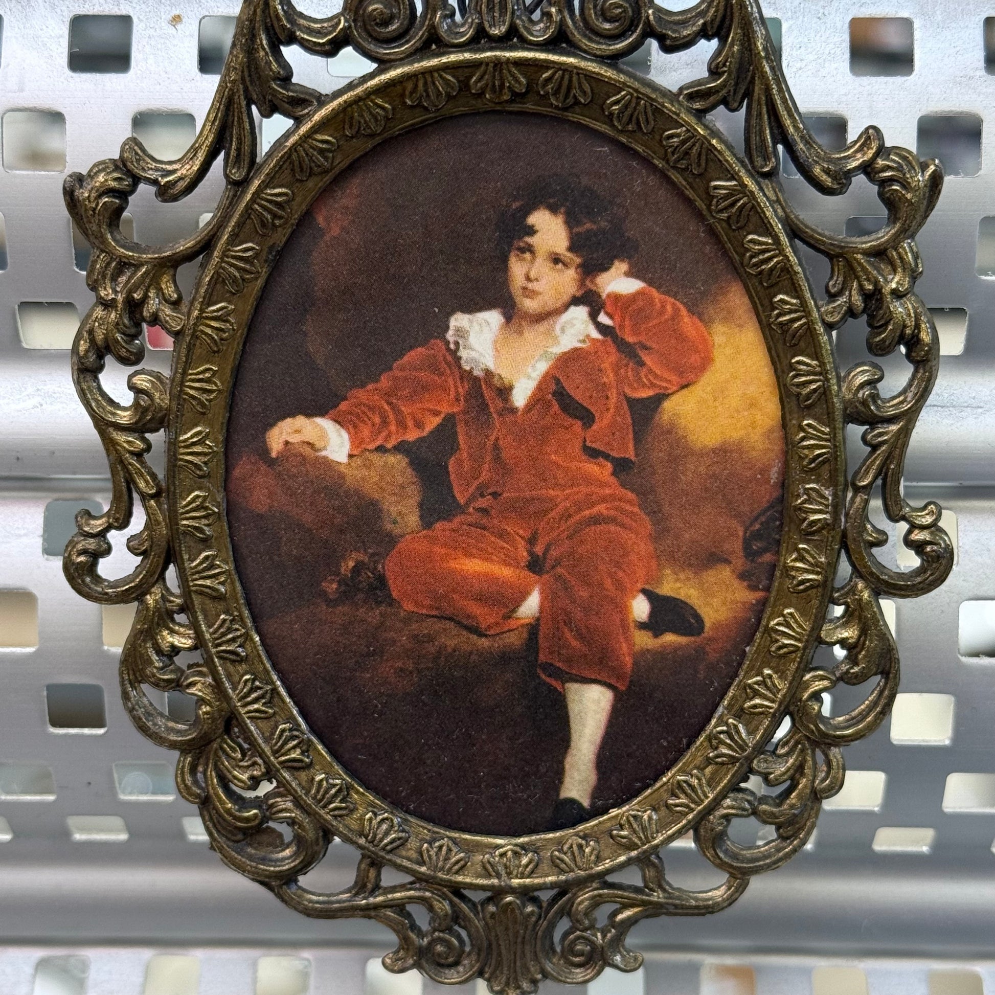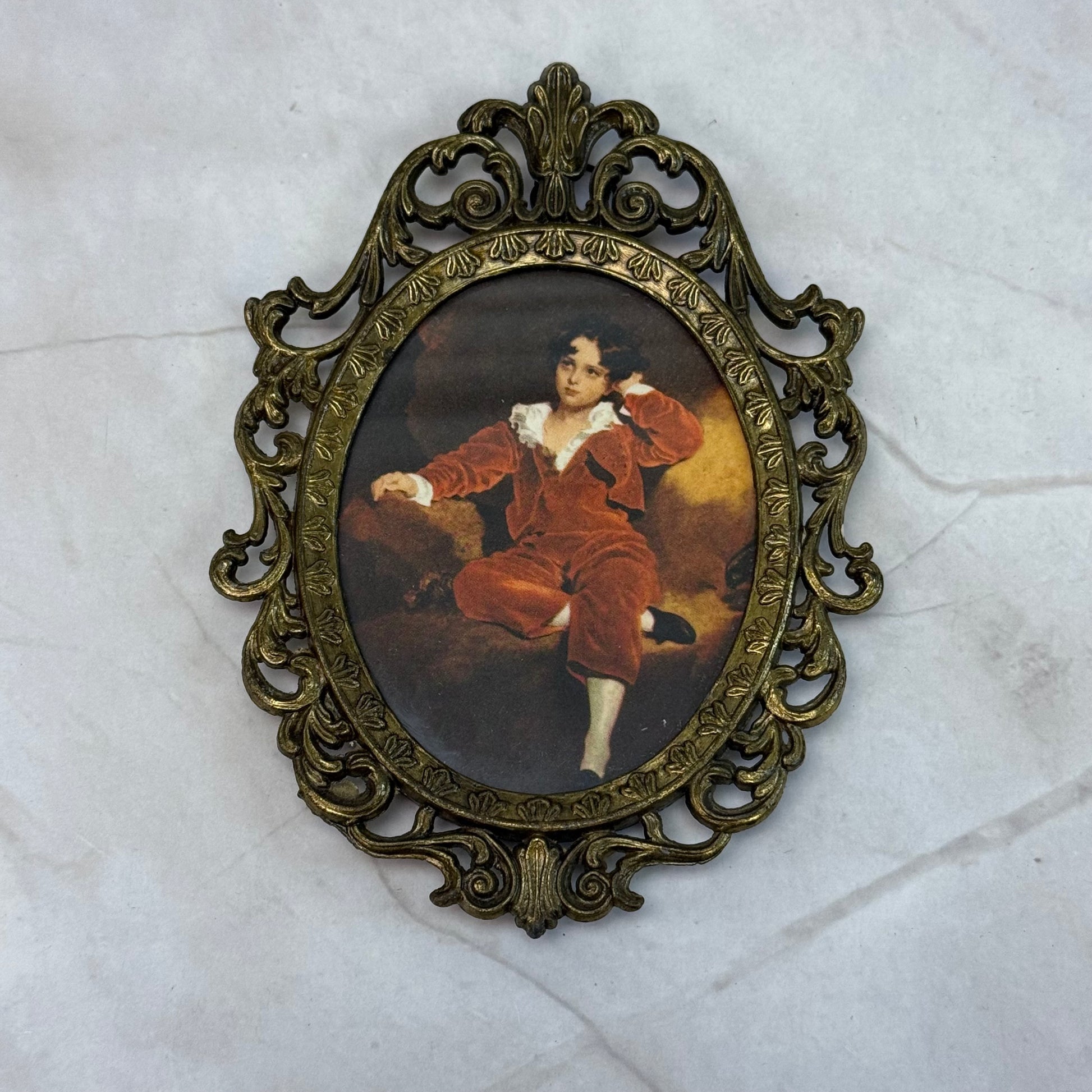 keywords: Sir Thomas Lawrence, The Red Boy, vintage art print, Italian brass frame, Romantic portrait, 19th century art reproduction, collectible wall décor, antique style frame, miniature artwork, classical home décor