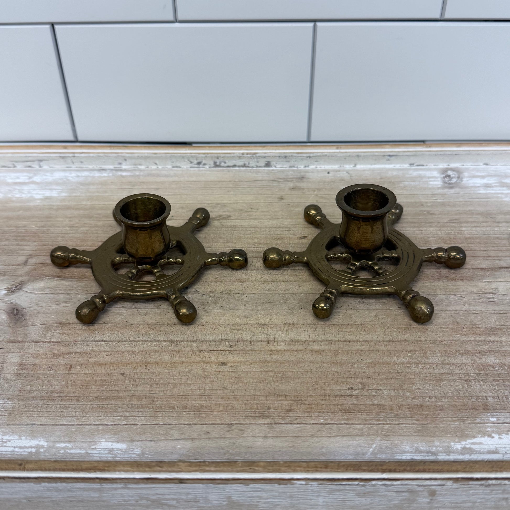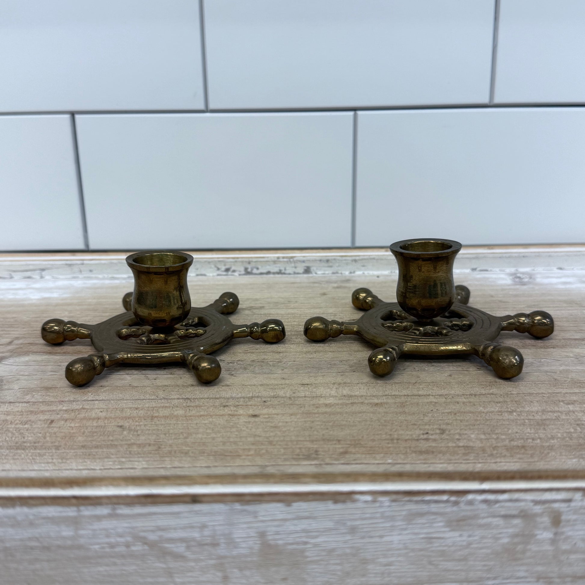 Solid Brass Ship’s Wheel Candlestick Holders, Set of 2