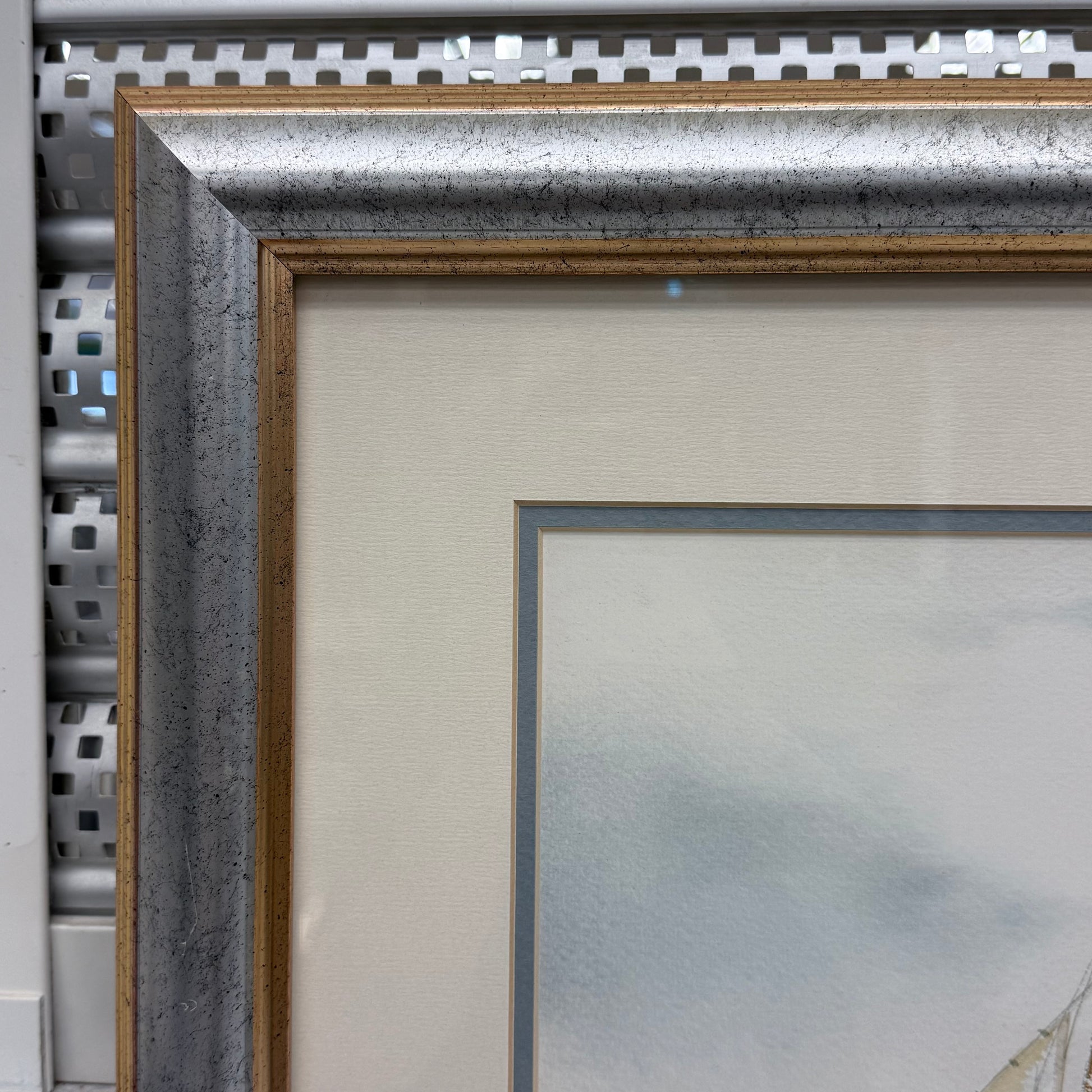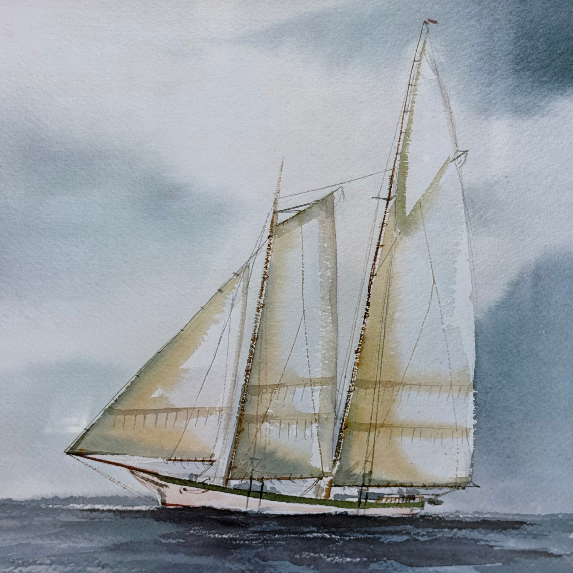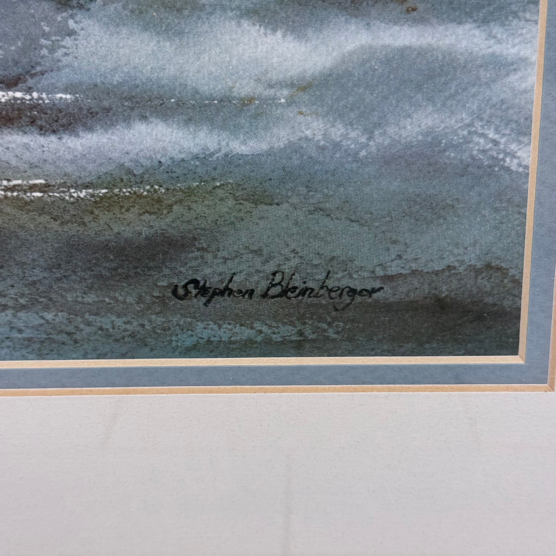 A serene and atmospheric maritime scene, this framed art print by Stephen Bleinberger captures the quiet elegance of a full sail schooner gliding across open water beneath a soft, overcast sky. Rendered in a muted palette of blues, grays, and warm sail tones, the composition evokes a sense of calm movement and coastal nostalgia, making it an ideal addition to nautical, coastal, or traditional interiors. This high-quality offset print features the artist’s printed signature and is professionally matted and housed in a substantial silver and gold-toned frame that enhances its classic presentation. Offered in good vintage condition with minor wear to the frame consistent with age and use, this piece is ready to hang and display.