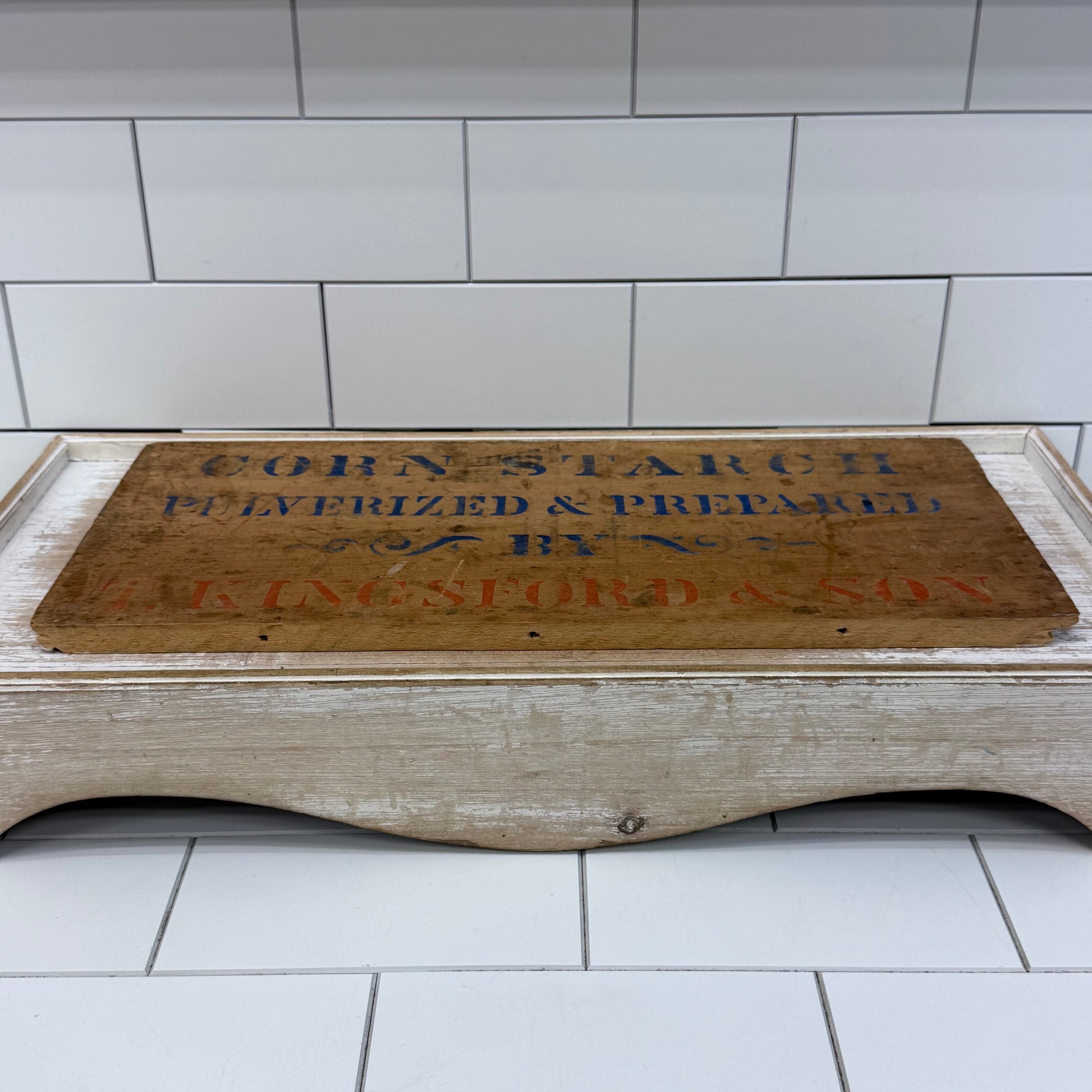 Keywords: T. Kingsford & Son, corn starch sign, vintage wood sign, rustic decor, cottagecore, farmhouse style, antique advertising, collectible sign, retro kitchen decor, nostalgic wall art