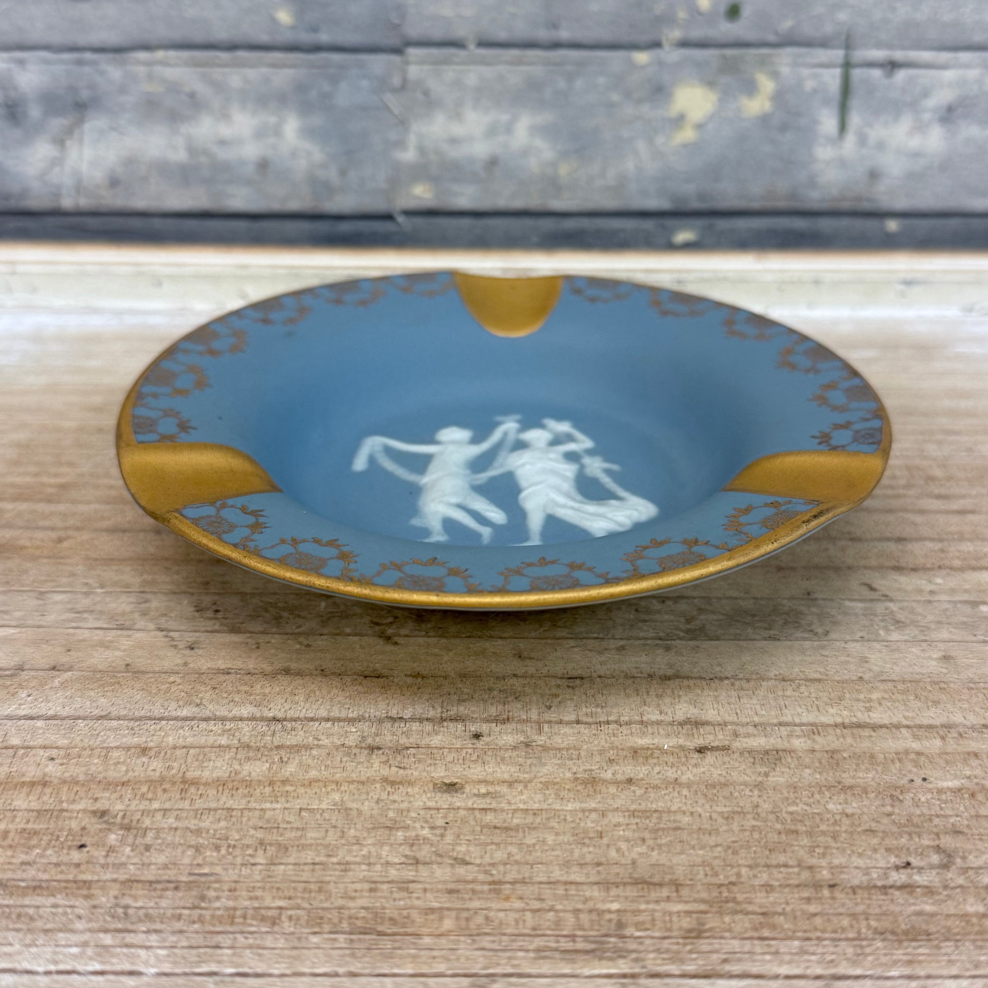 Elevate your vintage décor with this exquisite Tharaud Limoges Jasperware Dish, a timeless collectible showcasing fine French craftsmanship. In great vintage condition, this elegant 5” x 1” dish features embossed Grecian women dancing in graceful procession, framed by gilded edges that add a touch of opulence. Rendered in the iconic Jasperware matte finish, the classic pale blue base is beautifully contrasted with white bas-relief detailing and subtle gold accents. The authentic Tharaud Limoges maker’s mark is stamped on the underside, confirming its heritage and authenticity. A refined addition to any collection or a charming accent piece for neoclassical or vintage-inspired interiors.