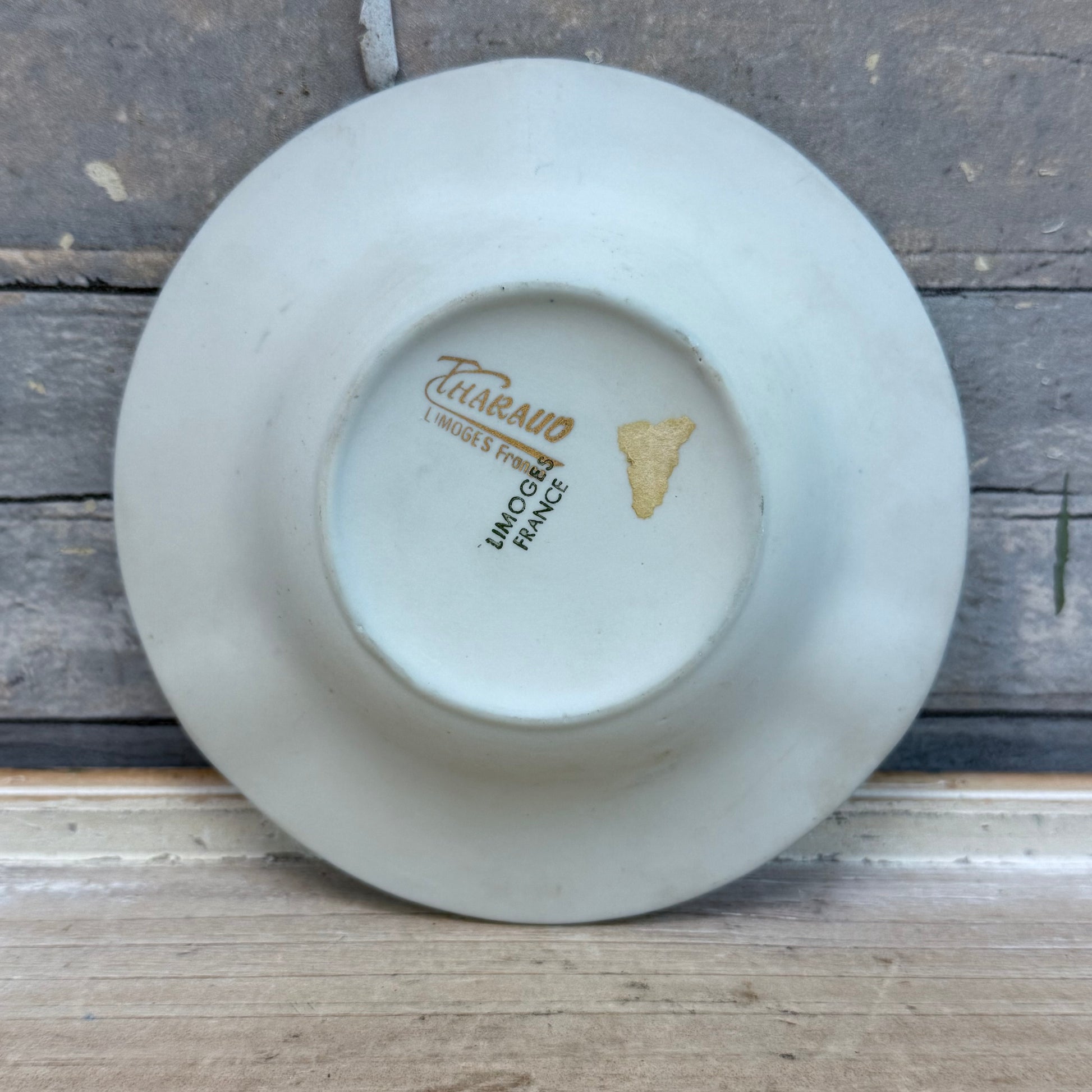 Keywords: Tharaud Limoges, Jasperware dish, vintage Limoges, Grecian décor, embossed porcelain, gilded edge dish, French collectible, blue and white dish, neoclassical style, matte finish porcelain