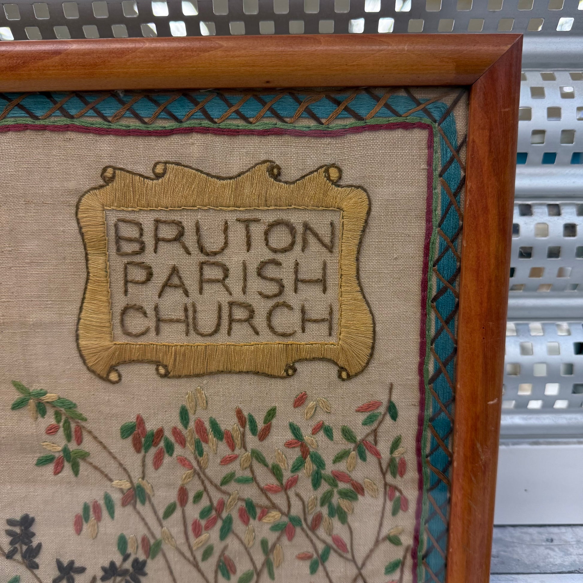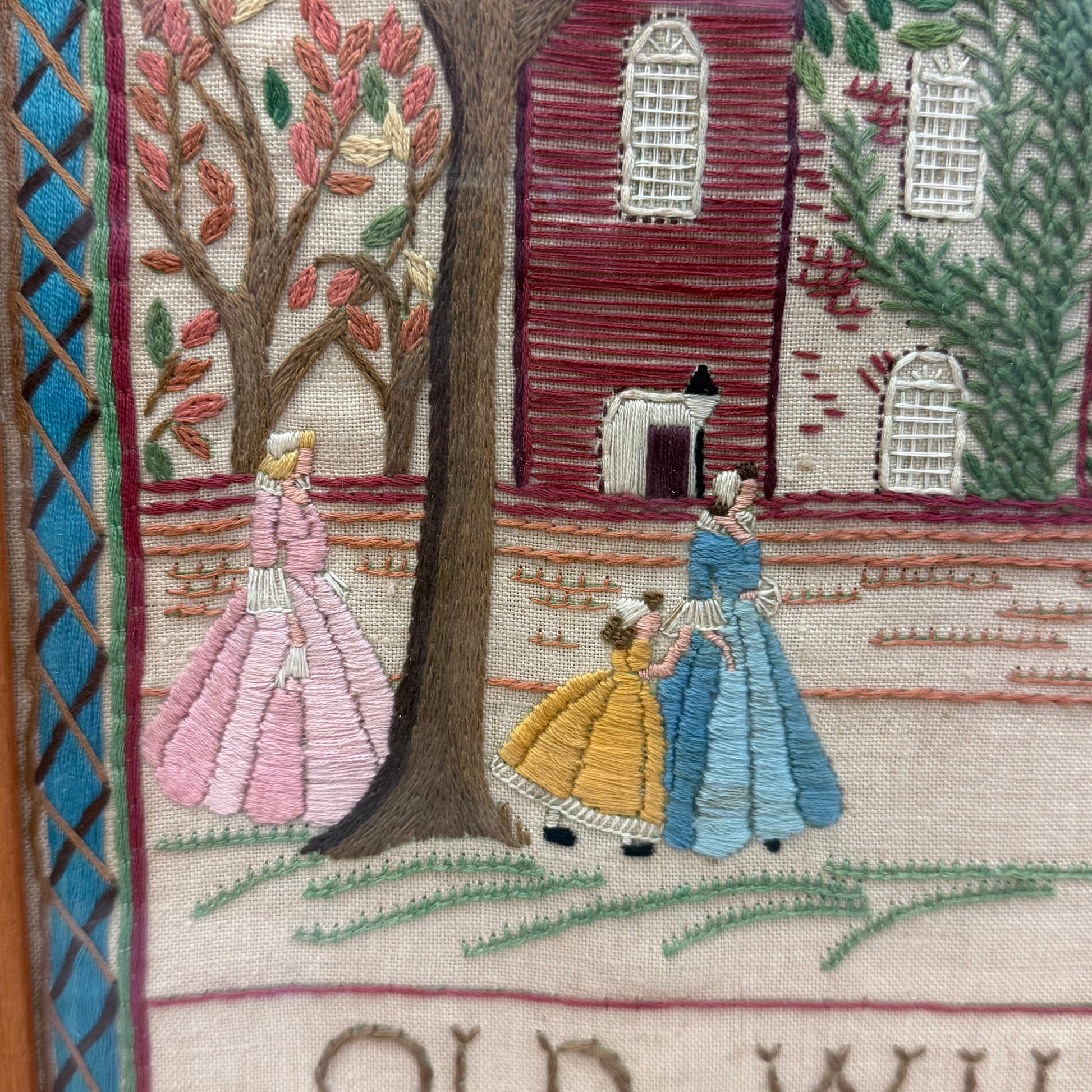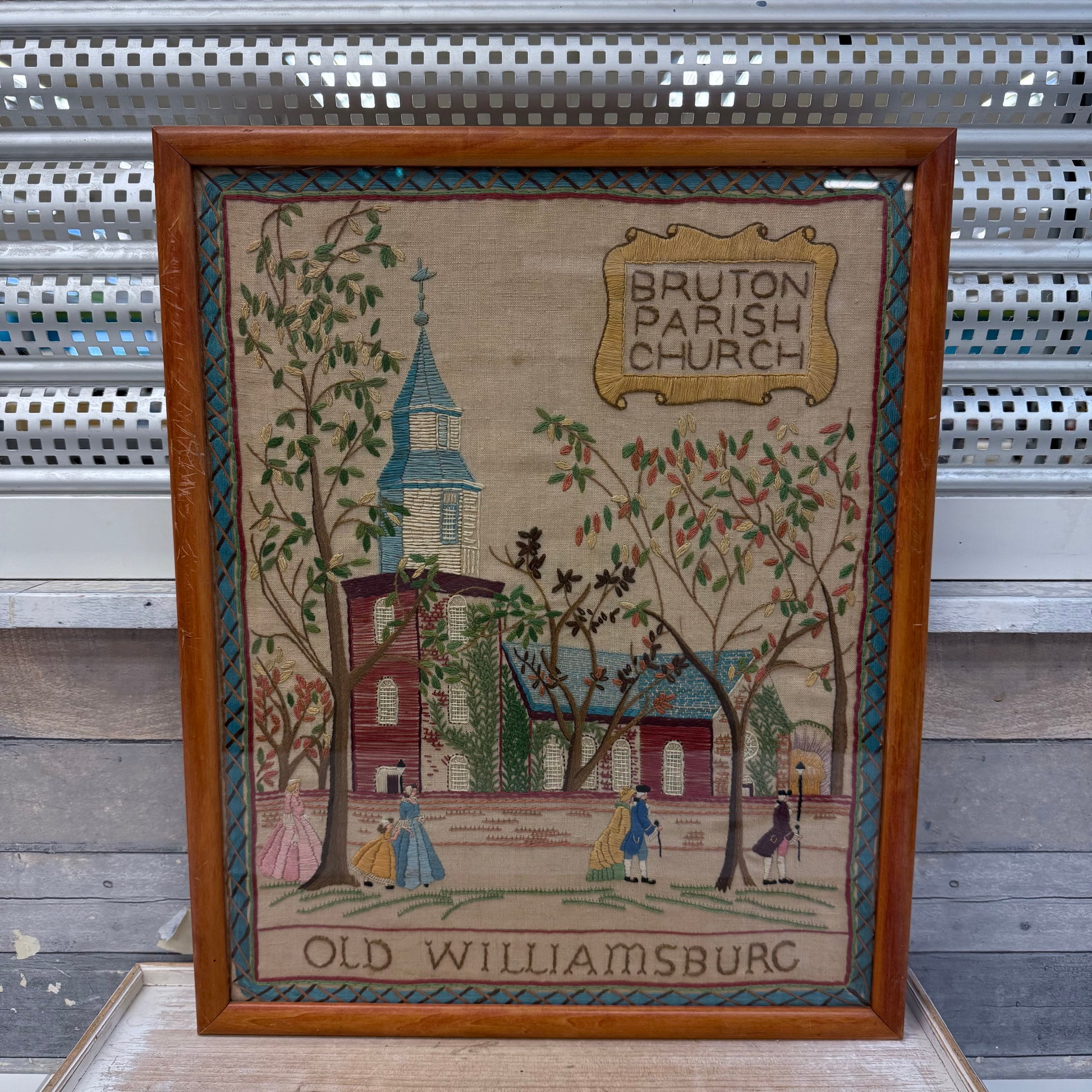 Keywords: Williamsburg art, Bruton Parish, embroidery wall art, vintage needlework, framed textile, colonial decor, folk art, historic church, Americana, handmade embroidery