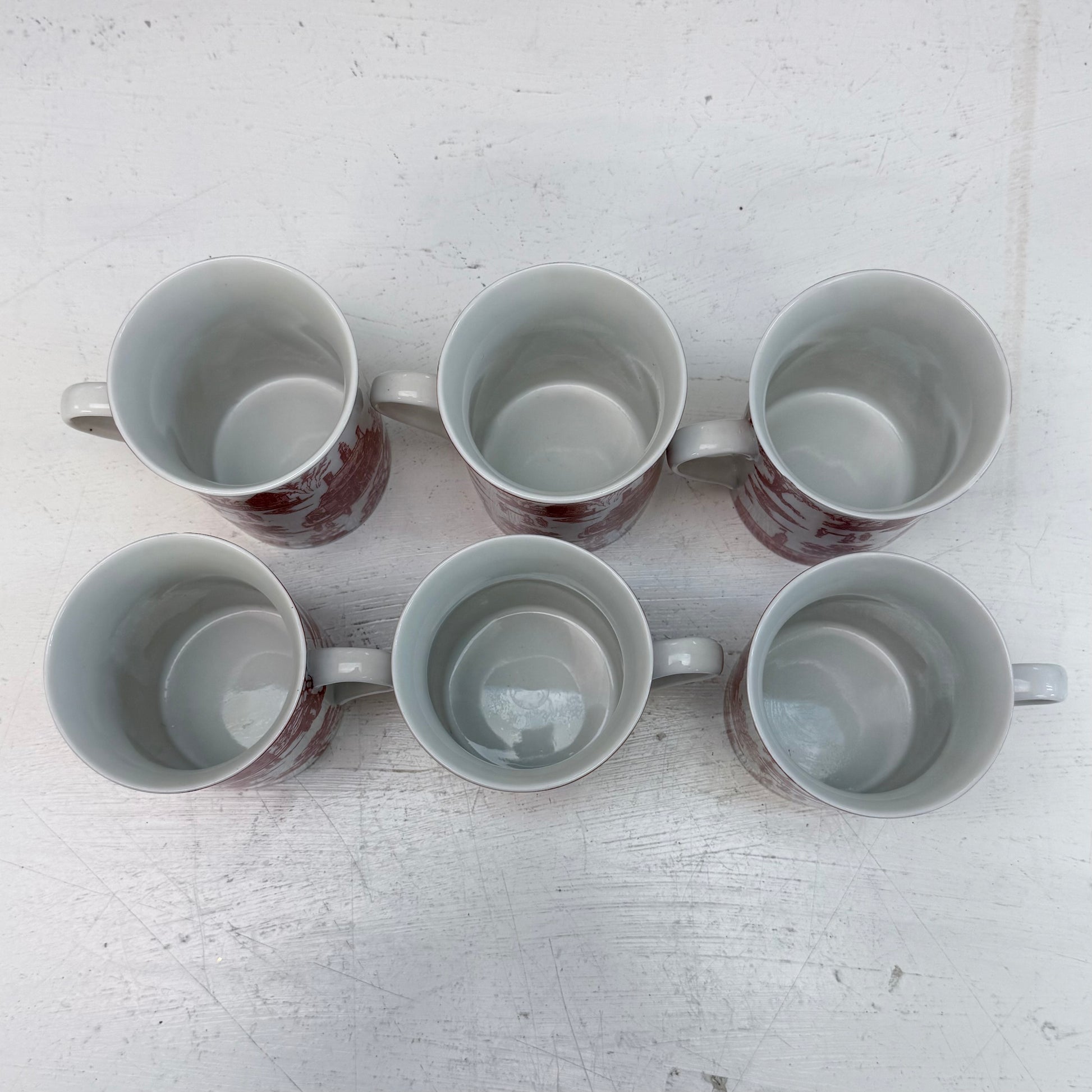 Add timeless elegance to your holiday table with this set of 6 Colonial Williamsburg Townscape Toile Porcelain Mugs in a striking red and white palette. Featuring detailed townscape scenes in classic toile style, these mugs offer a perfect blend of historic charm and festive flair. Each mug measures 4”x3”x4” and is marked on the underside. In good vintage condition with minor wear consistent with age and use, they’re ideal for holiday hosting, cozy winter mornings, or year-round colonial-inspired decor.