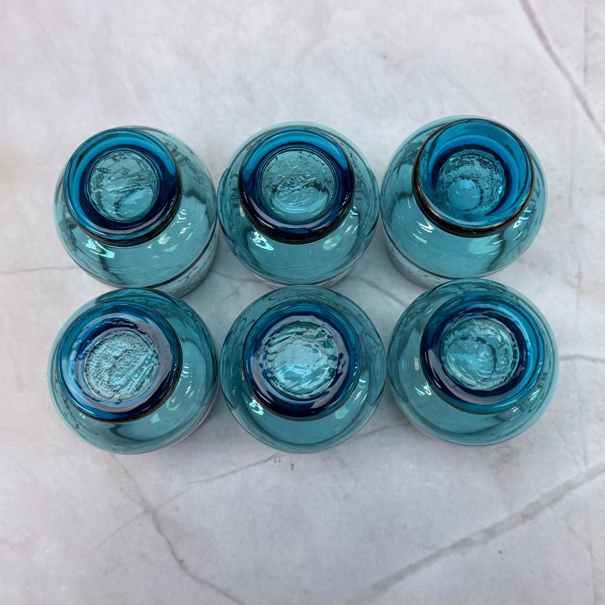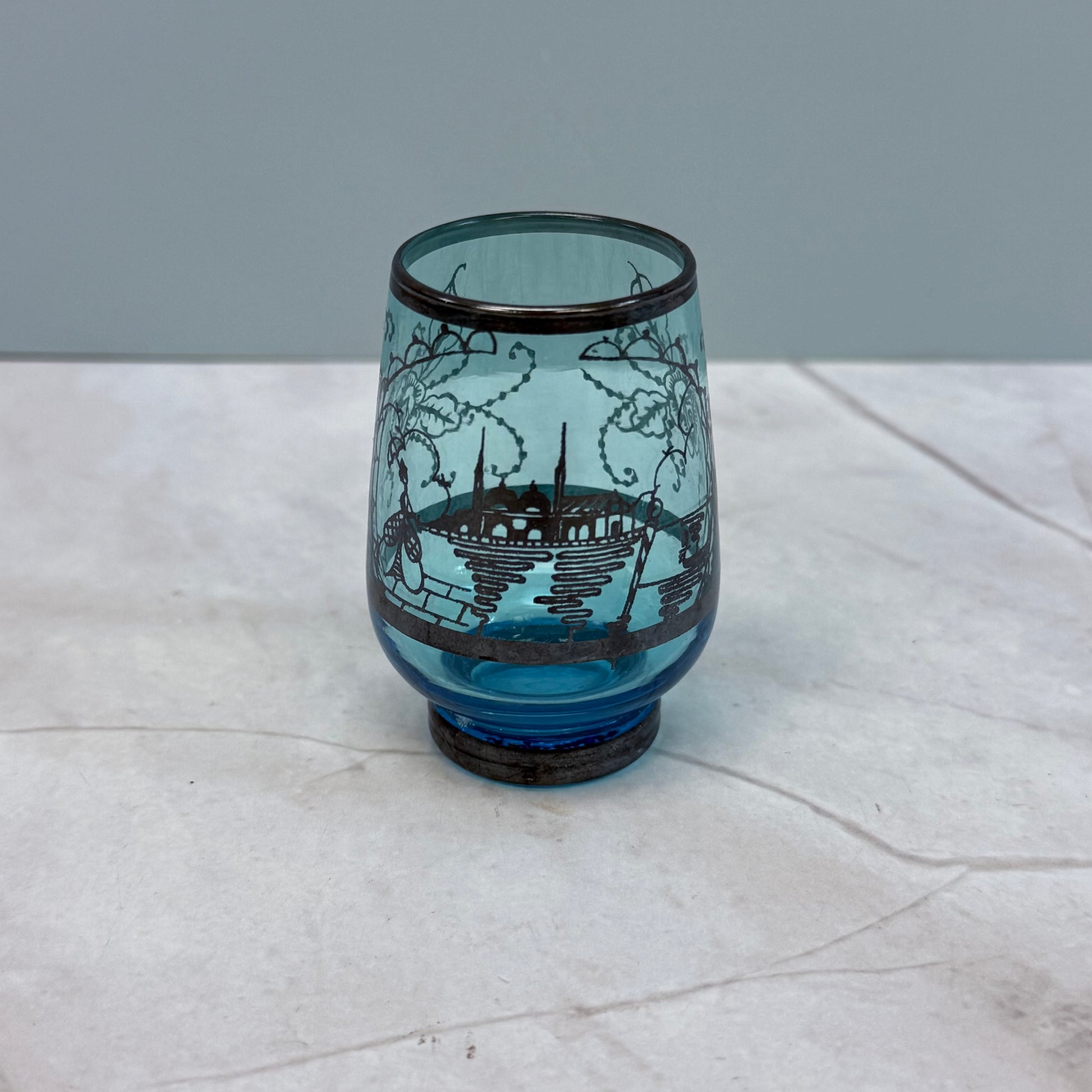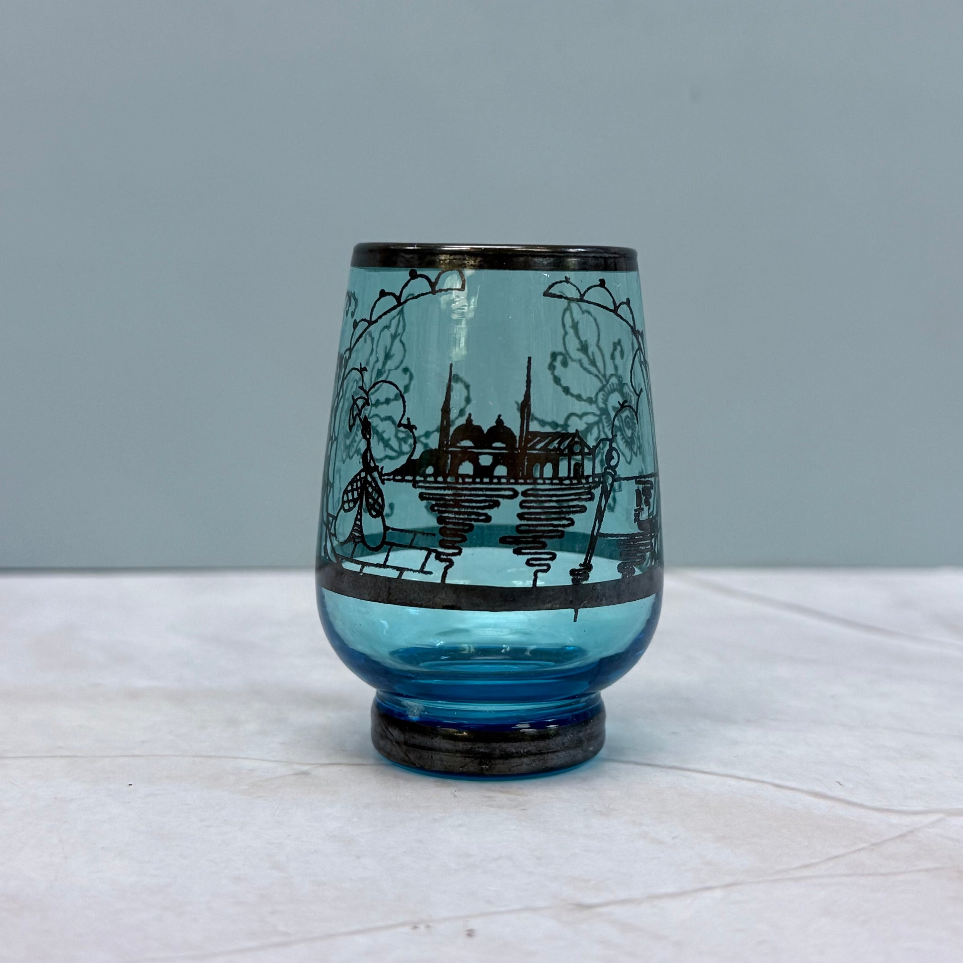 Bring a touch of old-world elegance to your collection with this Venetian Glass Decanter and Cordial Cups Set, featuring seven pieces in vibrant peacock blue. The decanter and six matching cups are adorned with intricate silver overlay designs, showcasing classic Venetian architecture and graceful scrollwork. Though the stopper is missing, the set remains in great vintage condition, perfect for display or special occasions. Decanter measures 4”x7”; each cup 2”x3”—a stunning example of Italian artistry and timeless charm.