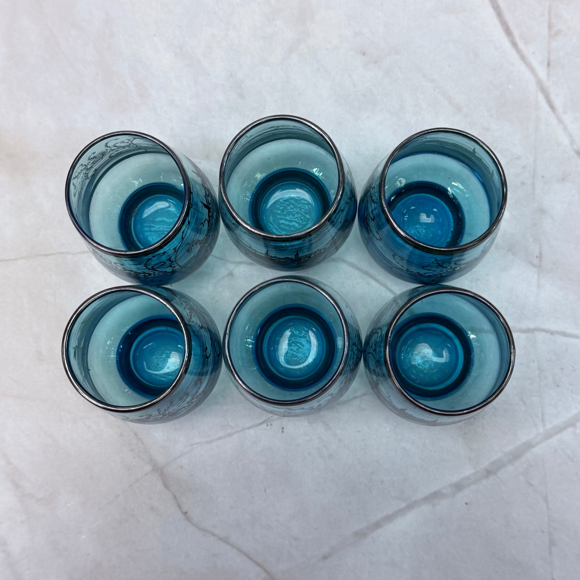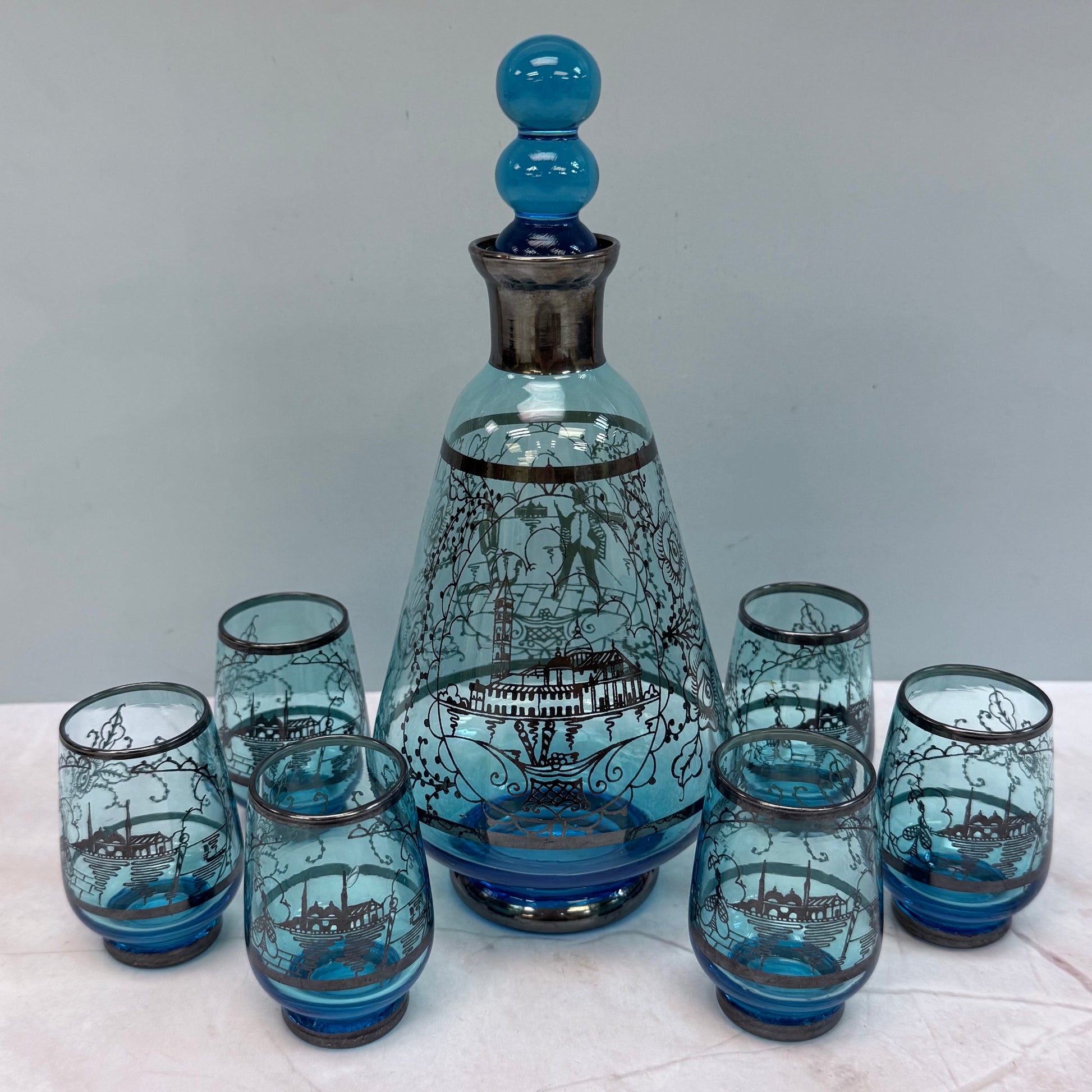 Keywords: Venetian glass, decanter set, silver overlay, peacock blue, cordial cups, vintage barware, Murano style, Italian glass, collectible glassware, Venetian decor
