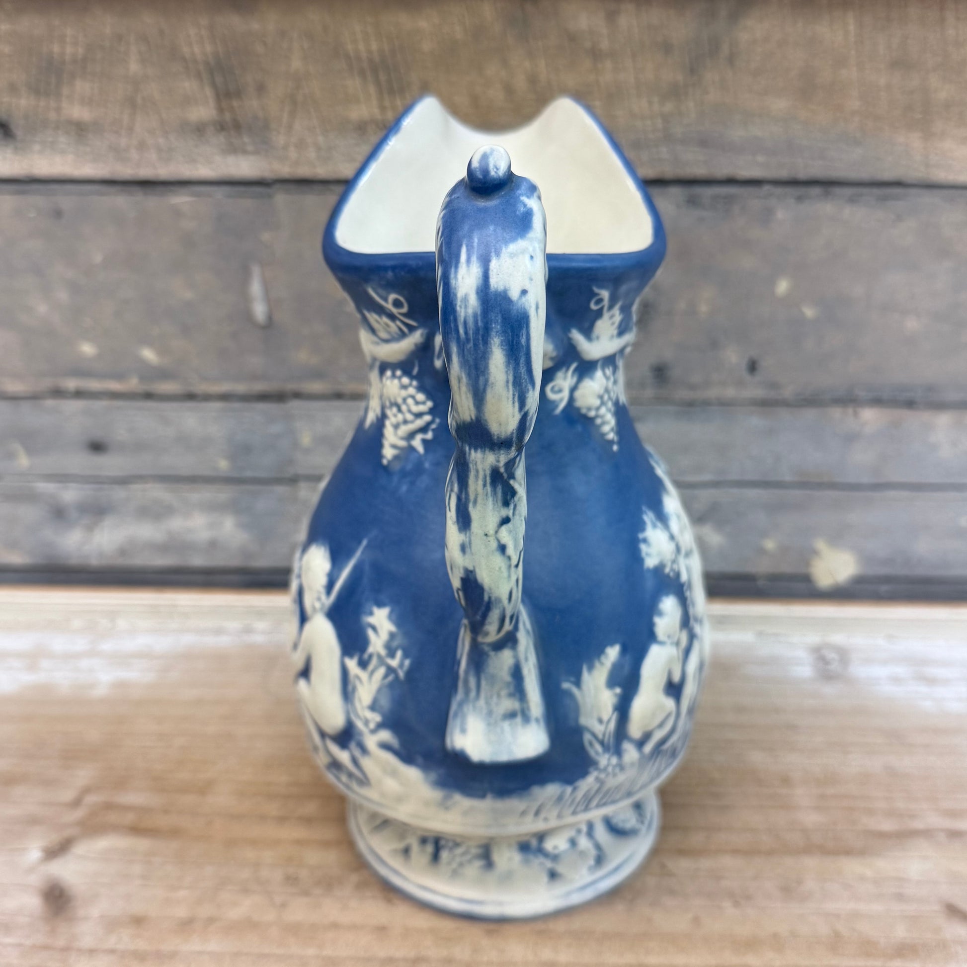 keywords: Wedgwood style, ceramic pitcher, embossed cherubs, vintage kitchenware, collectible ceramics, decorative pitcher, antique style, classic home decor, vintage servingware, cherub motif, neoclassical