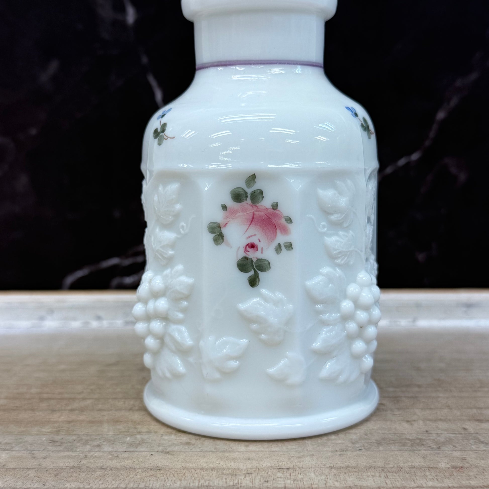 Keywords: Westmoreland, milk glass, hand-painted, embossed glass, vintage collectibles, maker’s mark, covered dish, decorative bottles, collectible glassware, classic home décor
